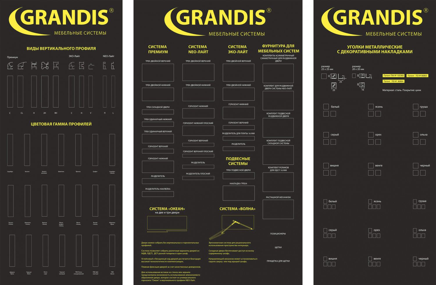 Стенд с образцами видов и цветов профиля GRANDIS